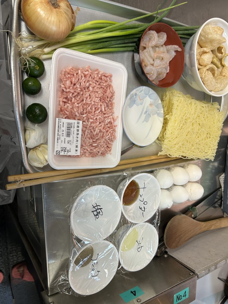 <注>ビーフンはいろいろなタイプ/が売られていますが、やはりもっちりしたフィリピン産のものが良いということです。いずれも最近は地域の海外食品を扱うスーパー(ユリショップ、Mahaloh、業務スーパーの一部など)での購入も可能です。最後に絞る柑橘類はフィリピンではフィリピン固有のカラマンシーという柑橘をつかいますが、今回は沖縄産のシークアーサーを使いました。