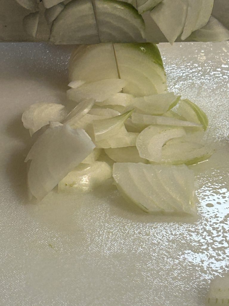・玉ねぎを半分に切りさらに上下を半分にしてから薄切りにします。