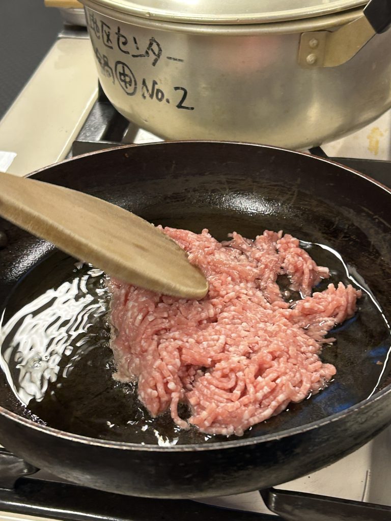 ・フライパンにたっぷりの油を入れて挽肉をいためます。