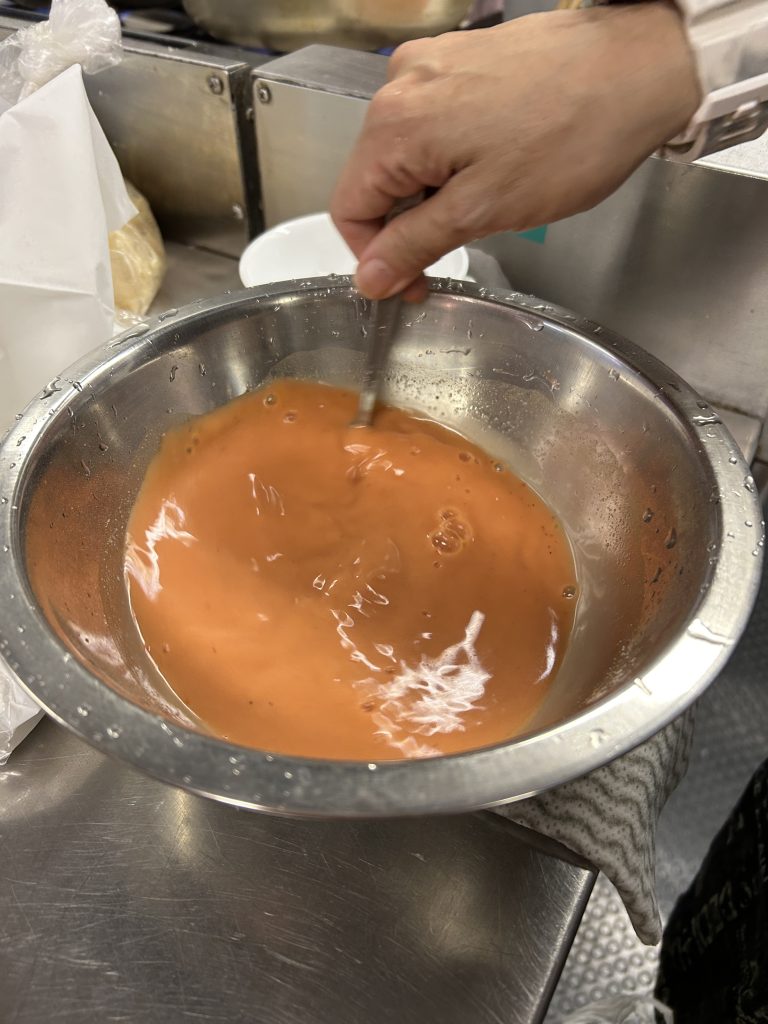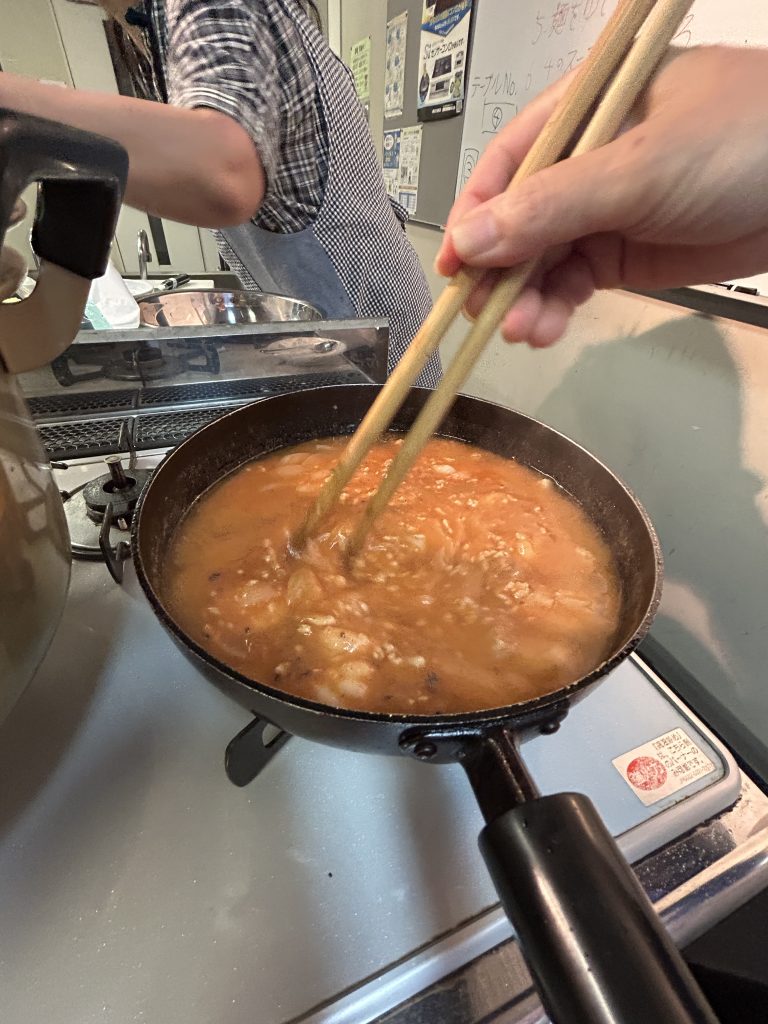 ・エビに火が通ったらパラボックスミックスを溶いたスープを加え、温まったら塩、胡椒、ナンプラーを味見しながら少量加えます。
