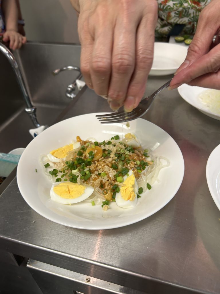3. たっぷりの湯でビーフンをやわらかくなるまで茹でてからざるにあげ、水気をきったら皿に盛ります。