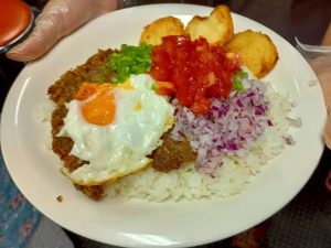 4. 2でつくったソースをかけ、卵をまわりにおき、チチャロン小葱を上から振りかけます。