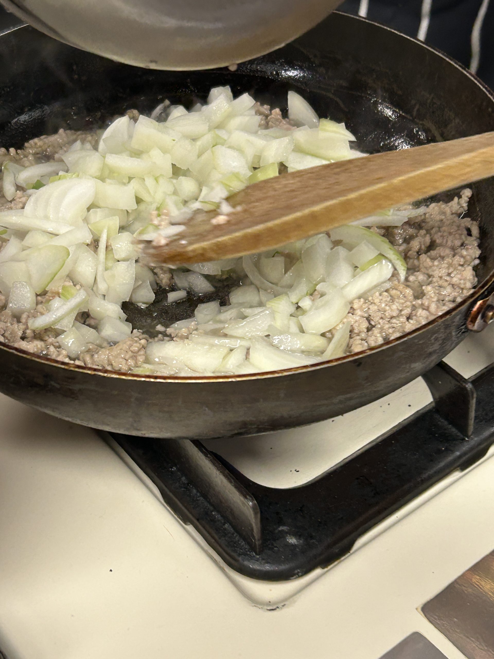 ・ 挽肉の色が変わったら玉ねぎとニンニクを加えてゆっくりいためます。