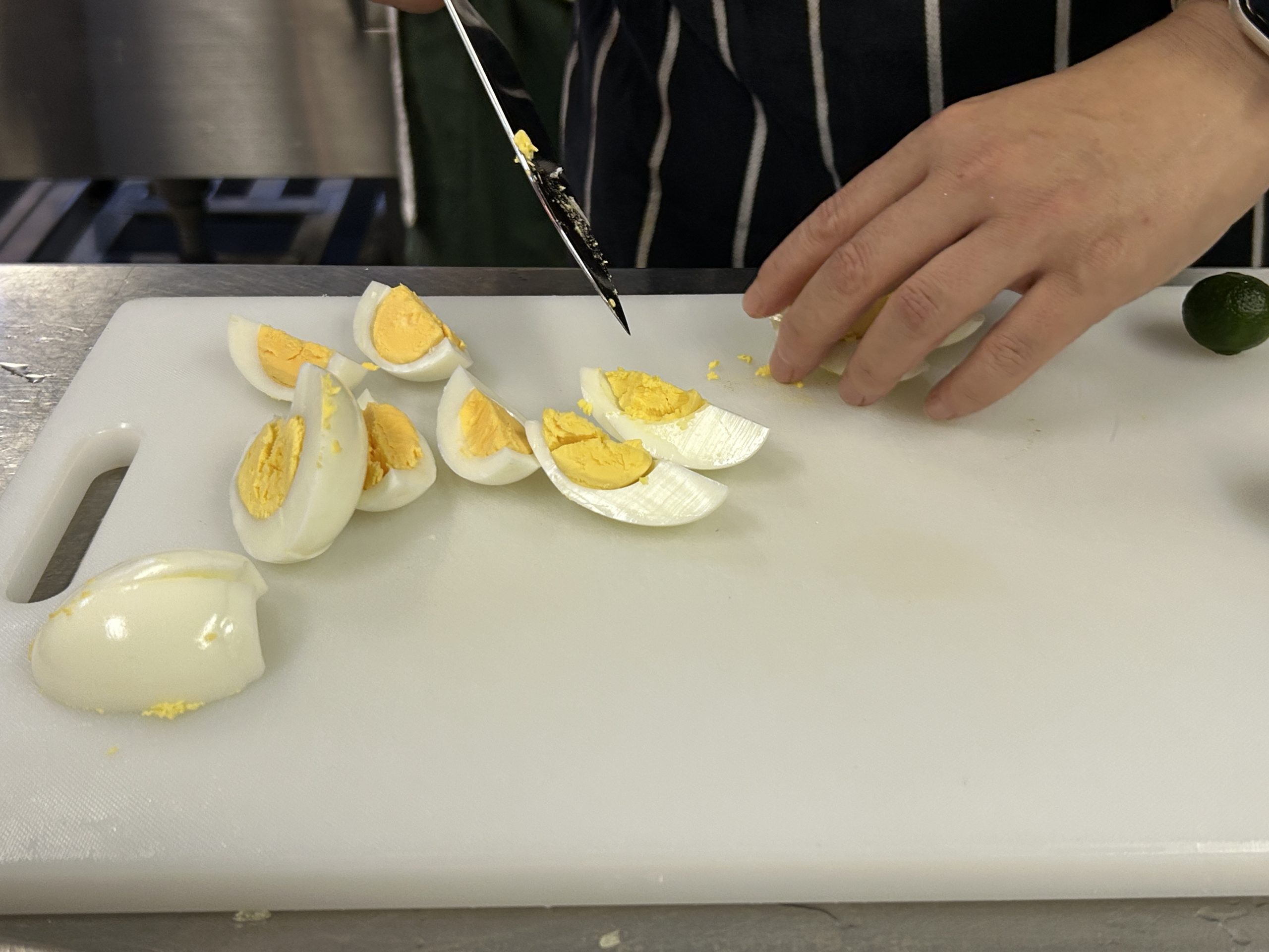 4. 2でつくったソースをかけ、卵をまわりにおき、チチャロン小葱を上から振りかけます。