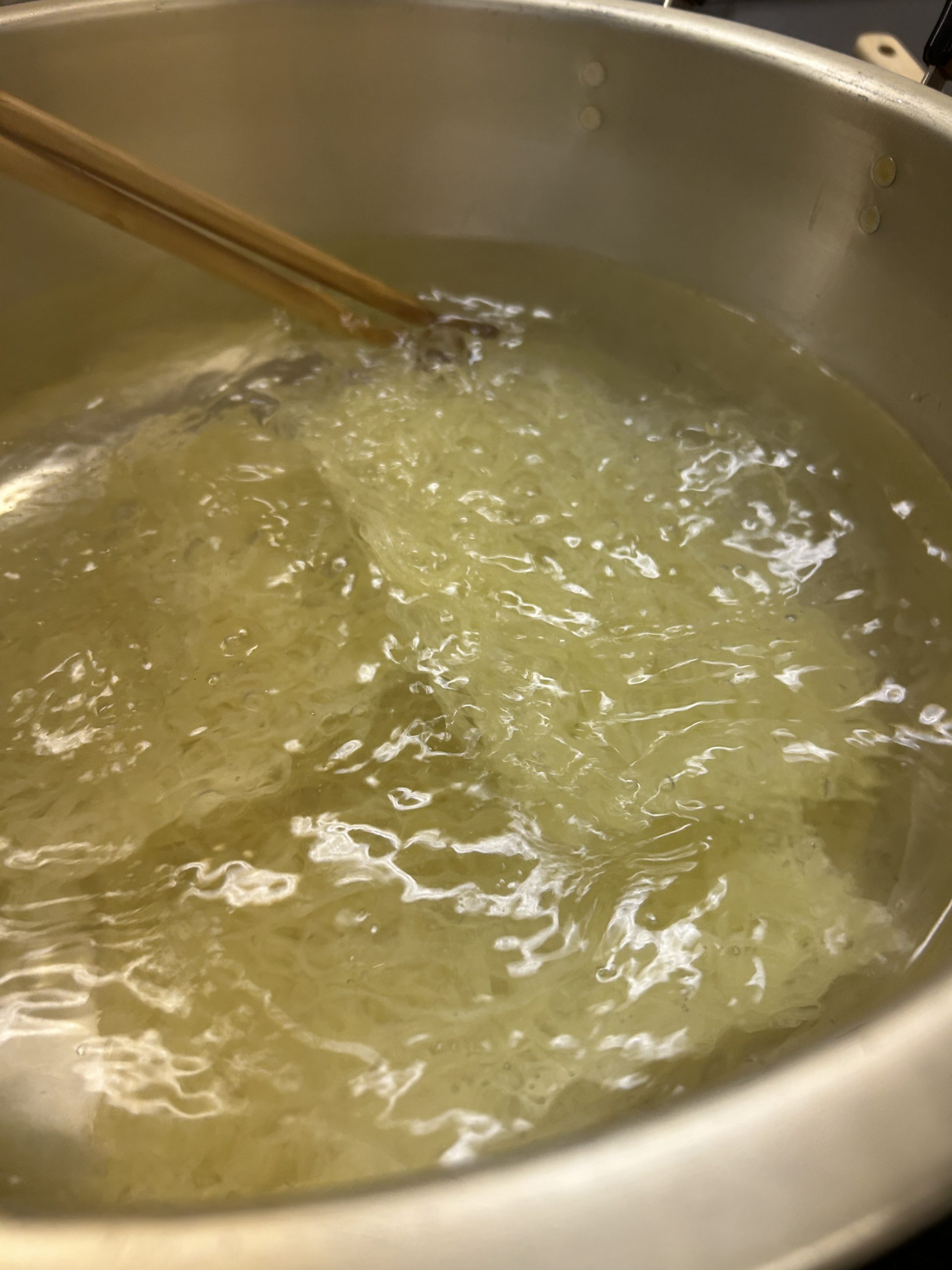 3. たっぷりの湯でビーフンをやわらかくなるまで茹でてからざるにあげ、水気をきったら皿に盛ります。