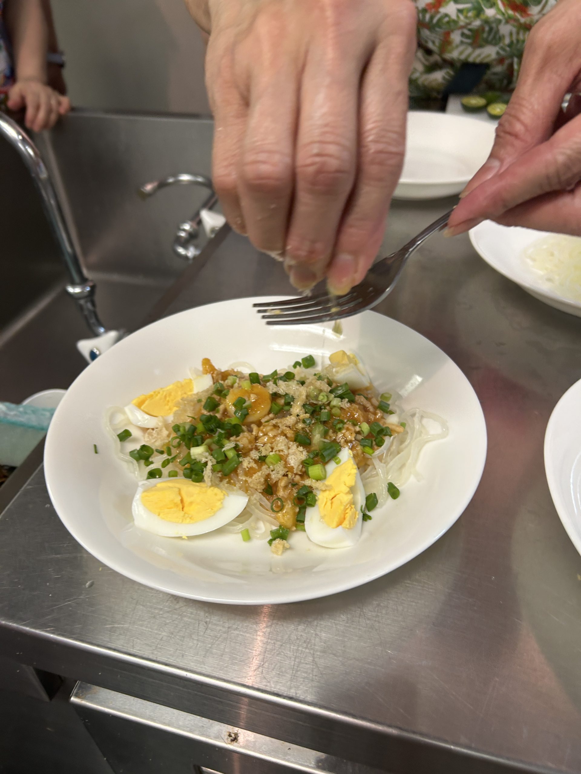 <注>ビーフンはいろいろなタイプ/が売られていますが、やはりもっちりしたフィリピン産のものが良いということです。いずれも最近は地域の海外食品を扱うスーパー(ユリショップ、Mahaloh、業務スーパーの一部など)での購入も可能です。最後に絞る柑橘類はフィリピンではフィリピン固有のカラマンシーという柑橘をつかいますが、今回は沖縄産のシークアーサーを使いました。