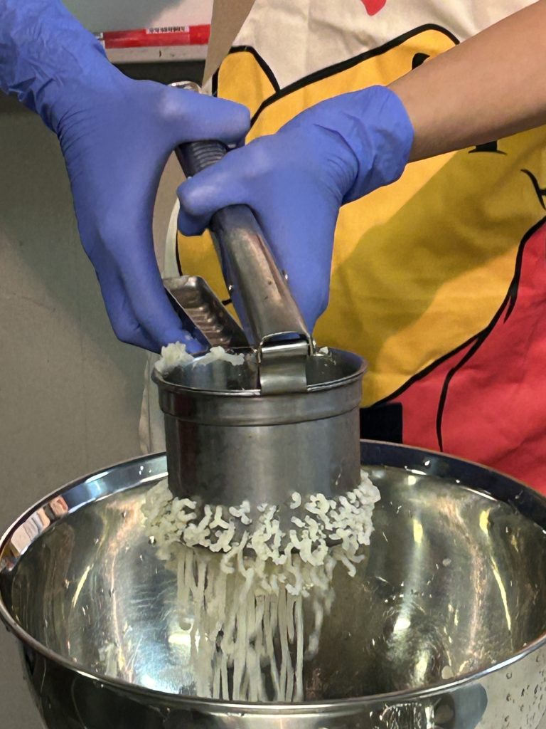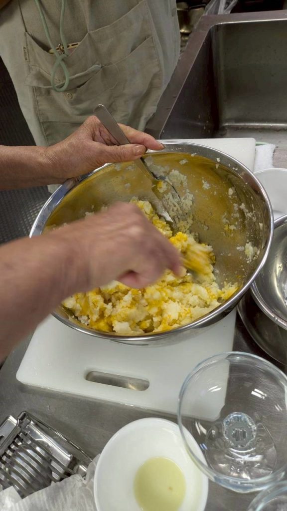 冷ましたじゃがいもにアヒ・アマリージョ、絞りたてのレモン果汁、塩を加えて味を調え、オリーブオイルとサラダ油をたらし、手でよくこねます。ここで丁寧にこねておくと出来上がりが滑らかになります。