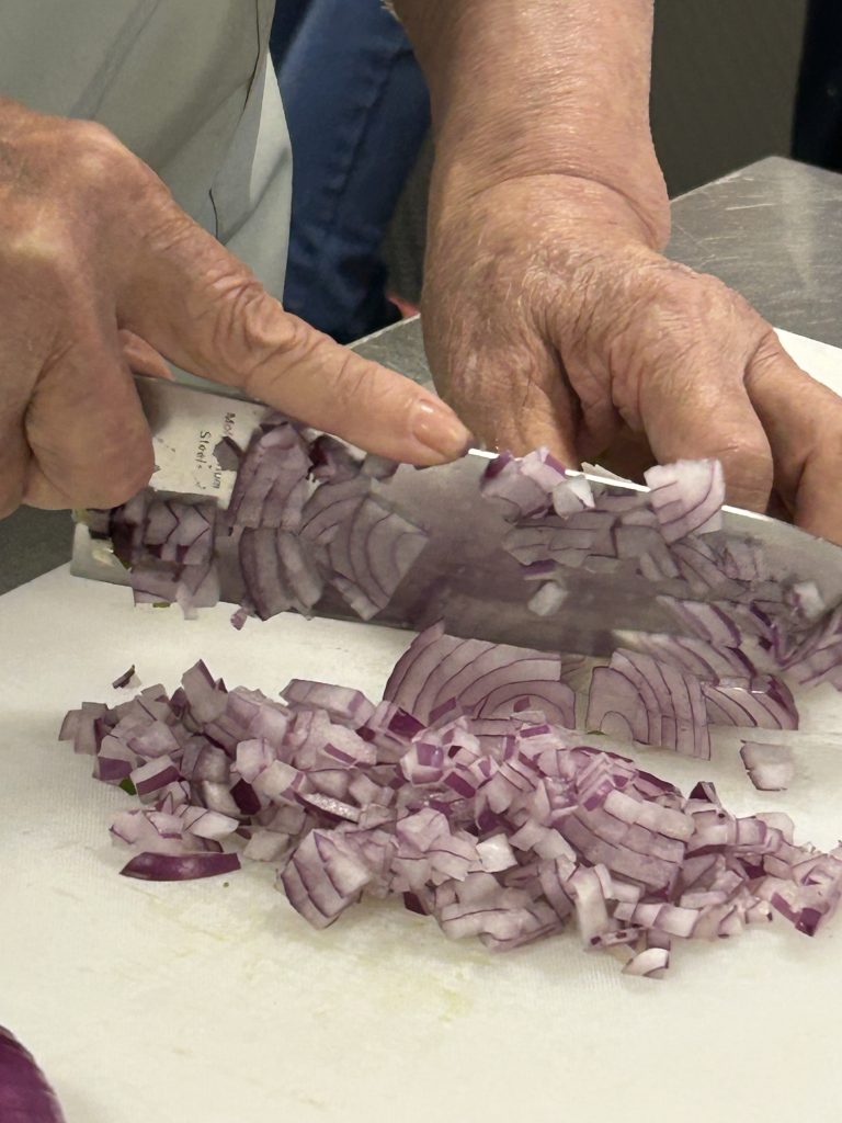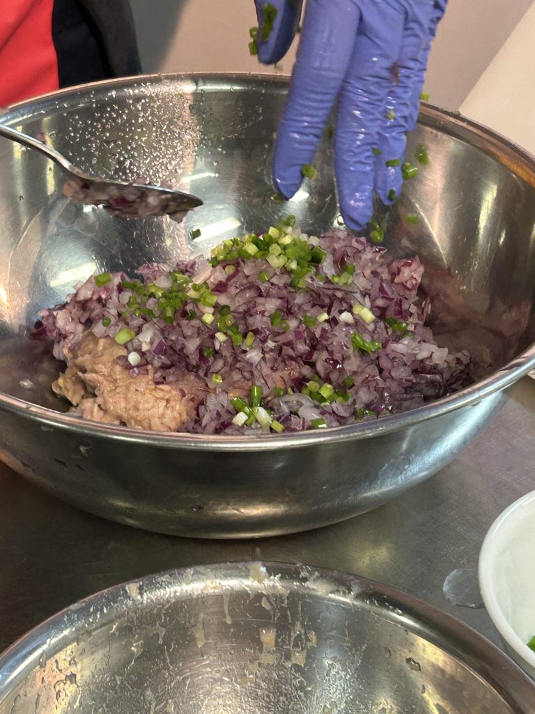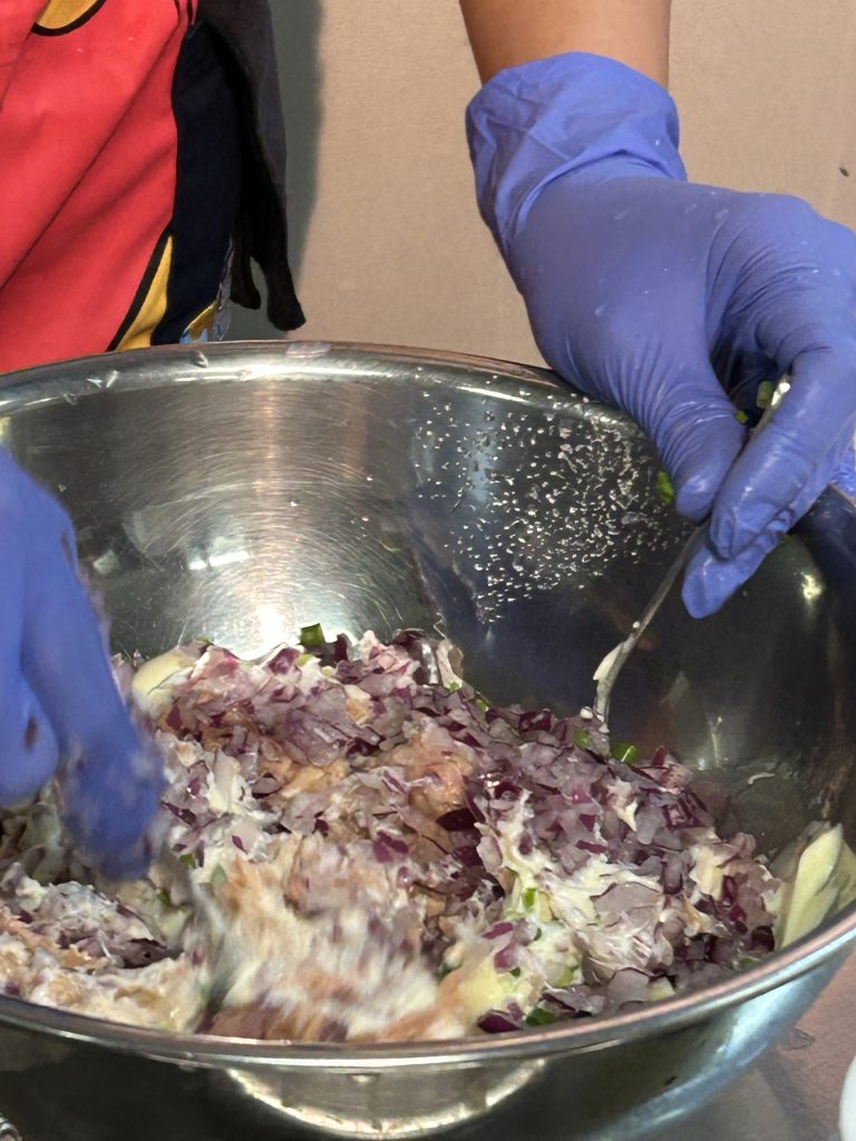 赤玉ねぎはみじん切りにして、塩水にさらしておきます。