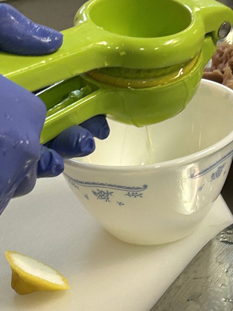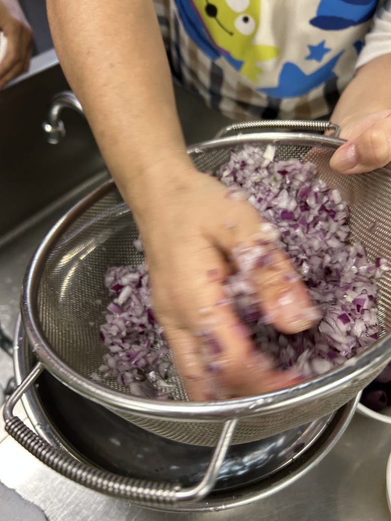 塩水にさらした赤玉ねぎに塩を振りかけて、混ぜながら水気をきっておきます。