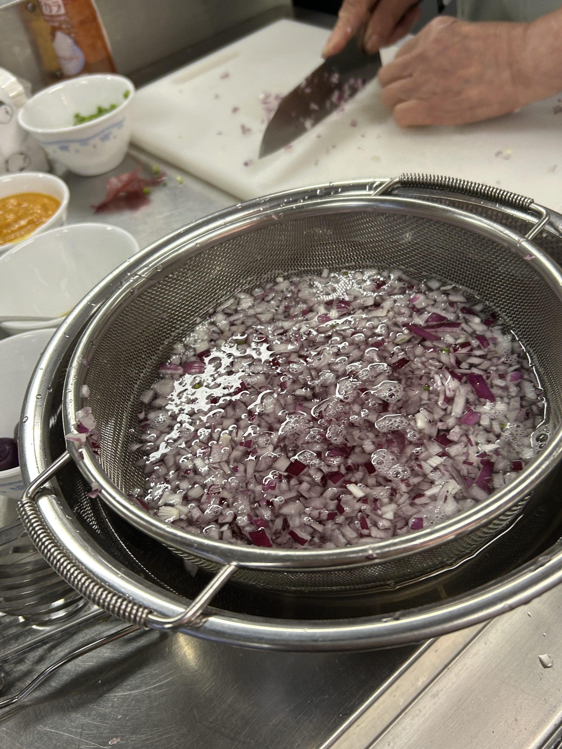 赤玉ねぎはみじん切りにして、塩水にさらしておきます。