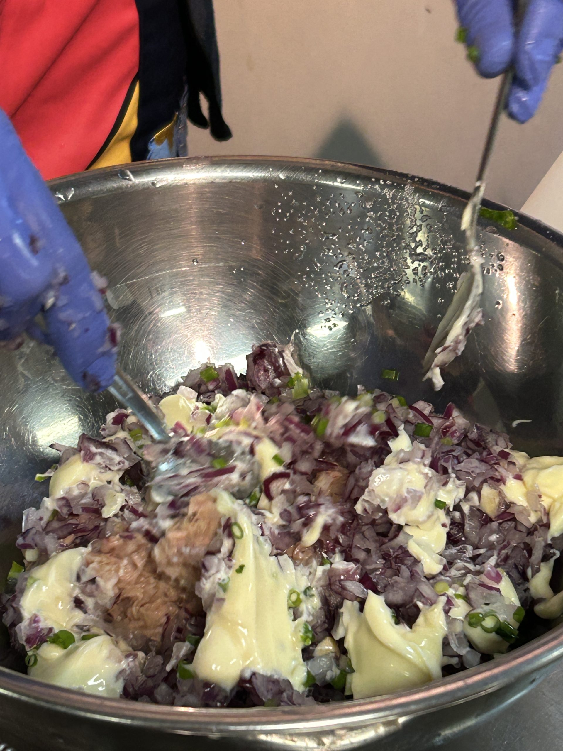 ボウルにほぐしたツナ缶、マヨネーズ、万能ねぎ2本分、赤玉ねぎを入れ、白胡椒をして混ぜておきます。