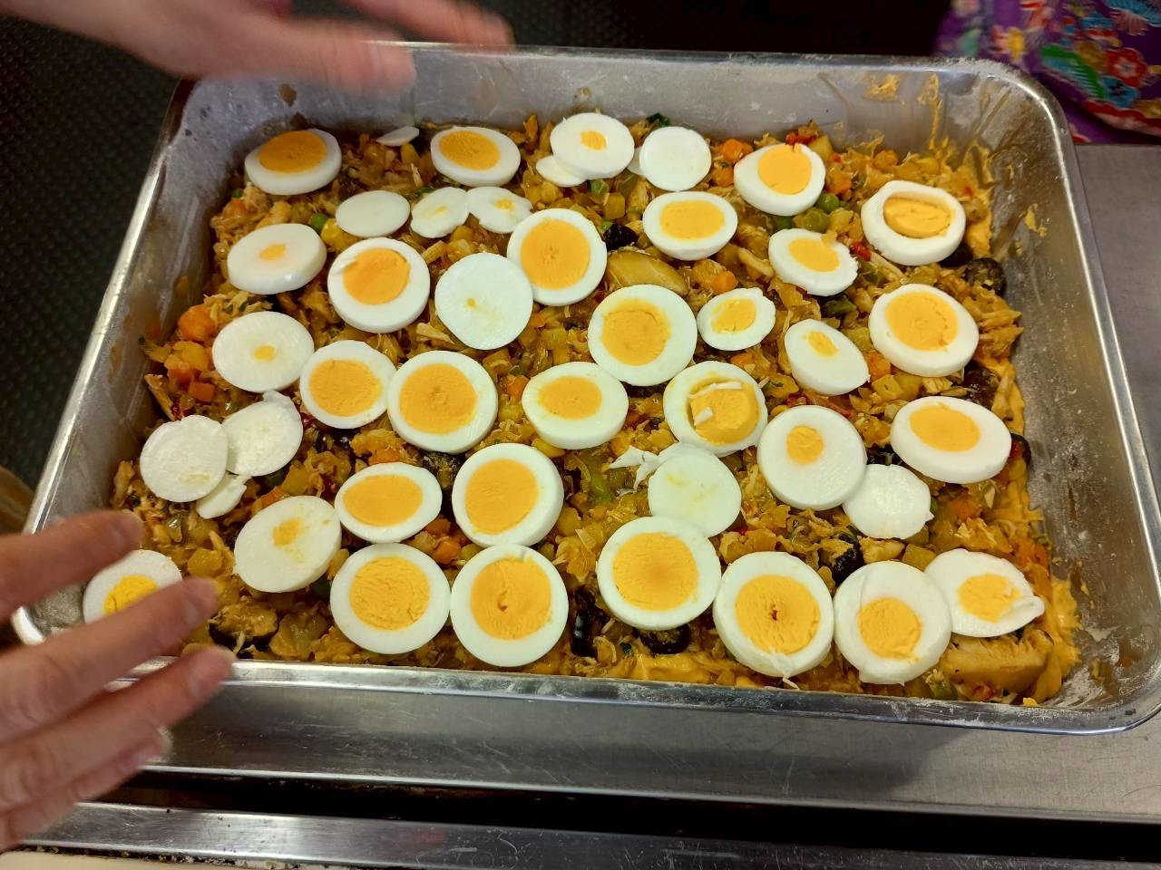 7)その上に4)を敷き、ゆでたまごを並べる。さらにその上に残った5)を延ばす。