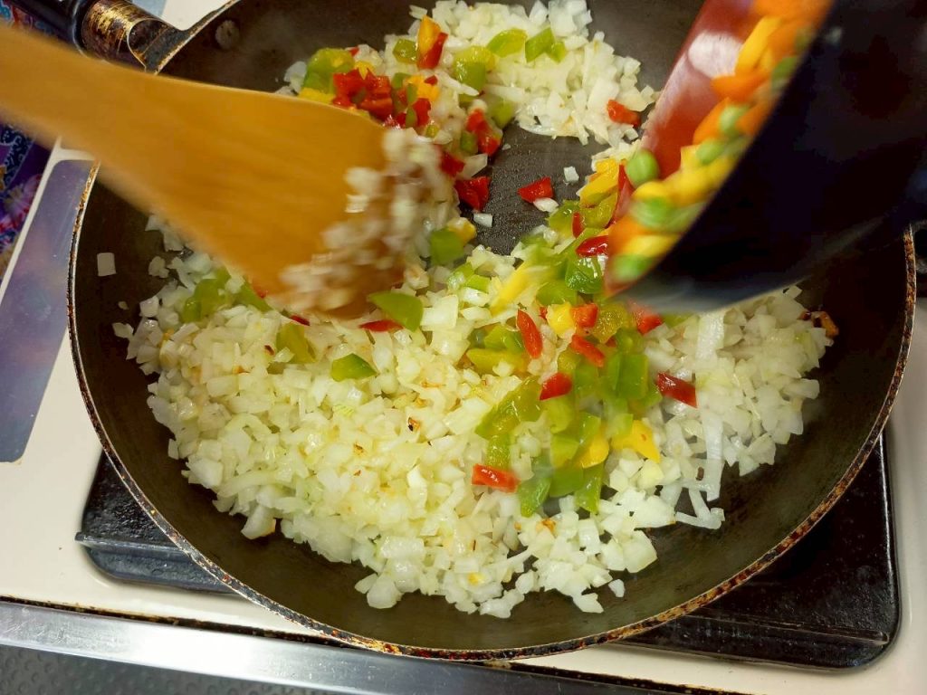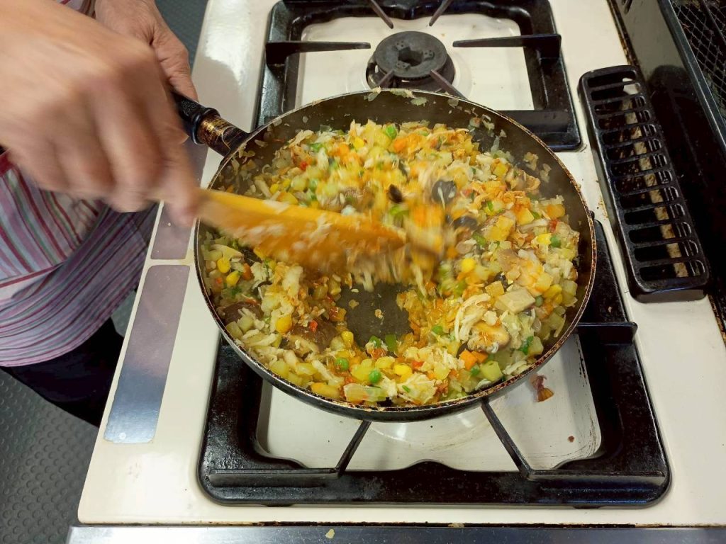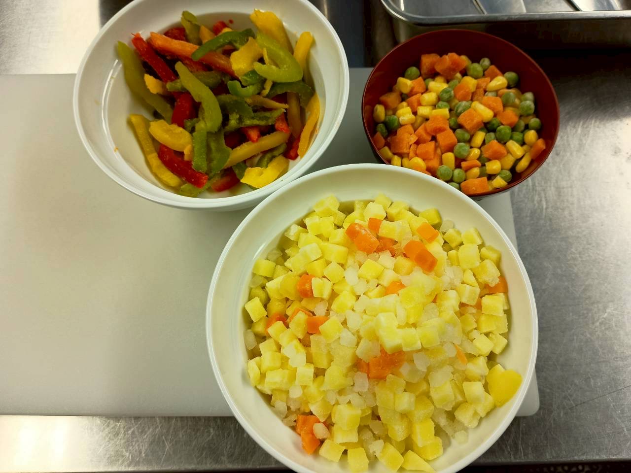 1)冷凍ポテト、ミックスベジタブル、パプリカ、きのこミックスを1cm角に切る。