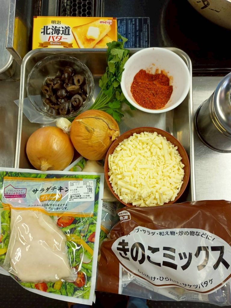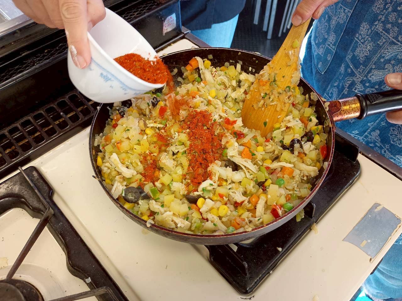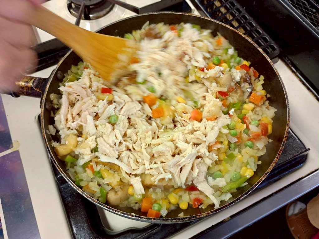火が通ったらサラダチキン、黒オリーブ、パセリを合わせ、塩コショウ、ミックススパイス入れ更に炒める。