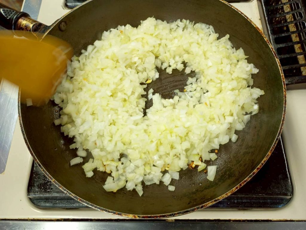 3)ニンニクをサラダオイルで炒め、香りがたったら、1)を炒め火を通す。