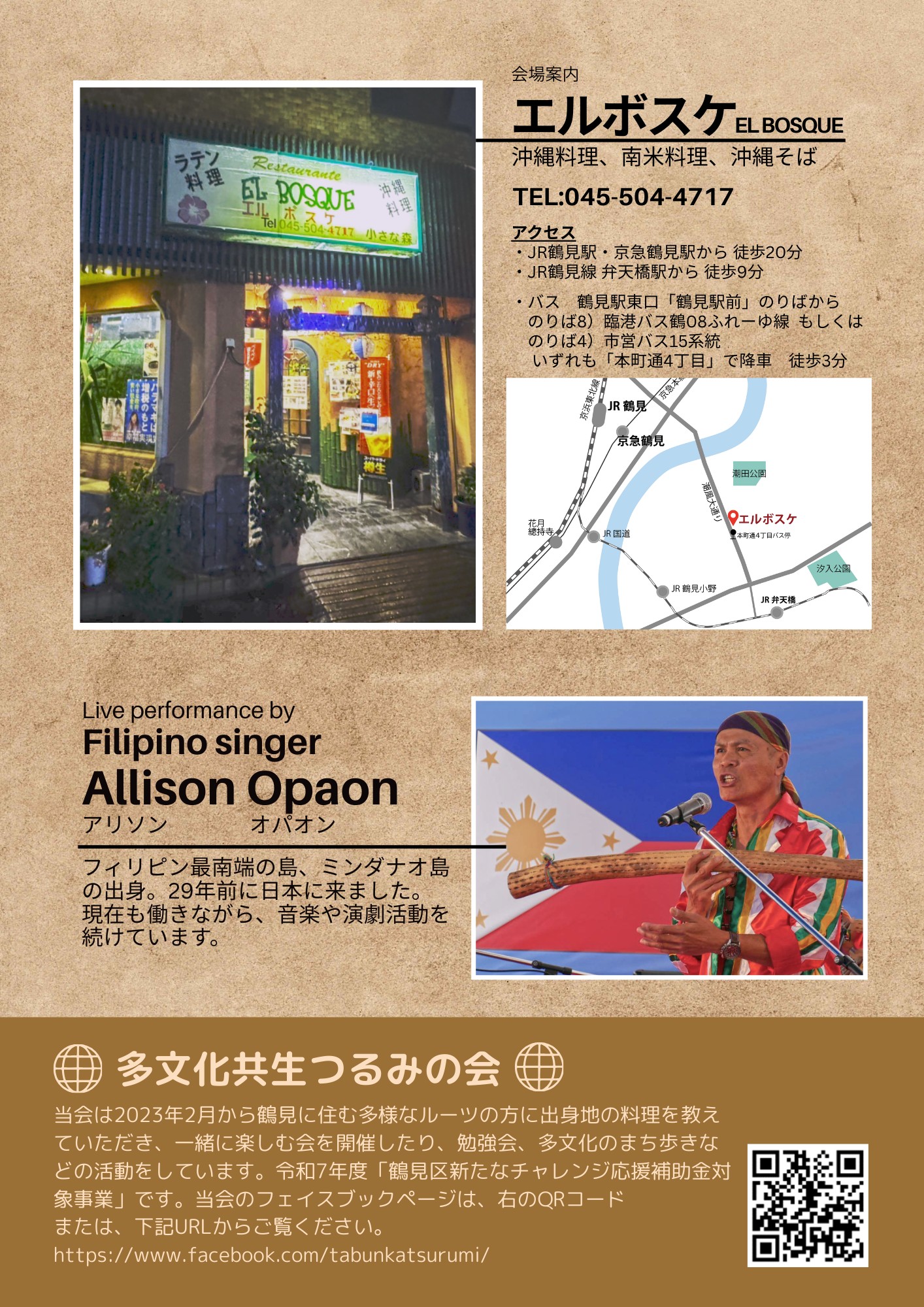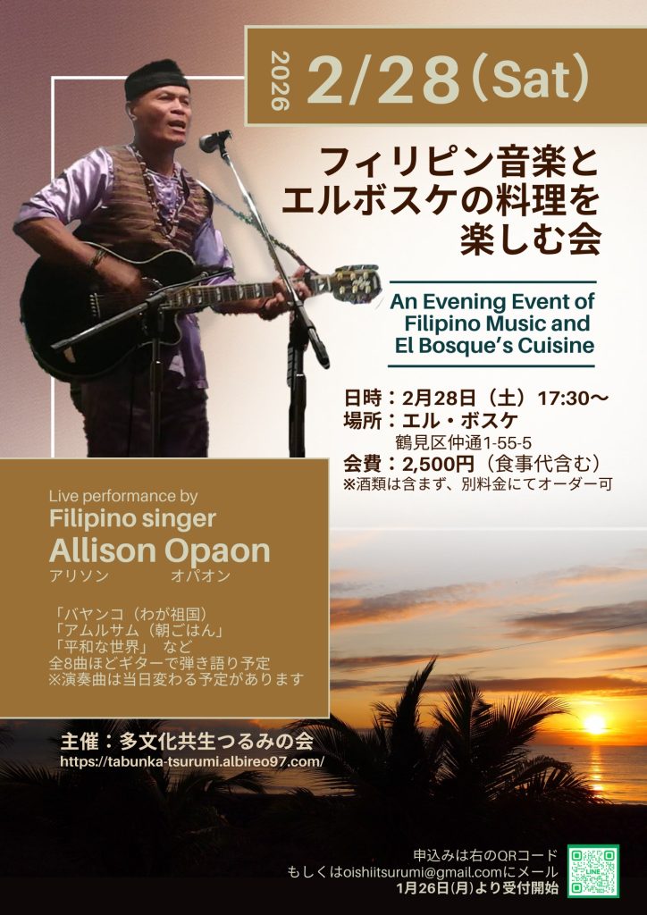 ・フィリピン音楽とエルボスケの料理を楽しむ会 2026.02.28 2026年1月31日 最終更新日時 : 2026年1月31日 Hashimoto 鶴見在住のフィリピンの歌手、アリソン・オパオンさんがギターを弾きながら歌ってくださいます。会場は沖縄南米料理のエルボスケで、お食事しながら、フィリピンの歌を楽しみませんか?お申し込みをお待ちしています。 申込みはメール oishiitsurumi@gmail.com か公式LNEからお願いします。 FacebookXCopy